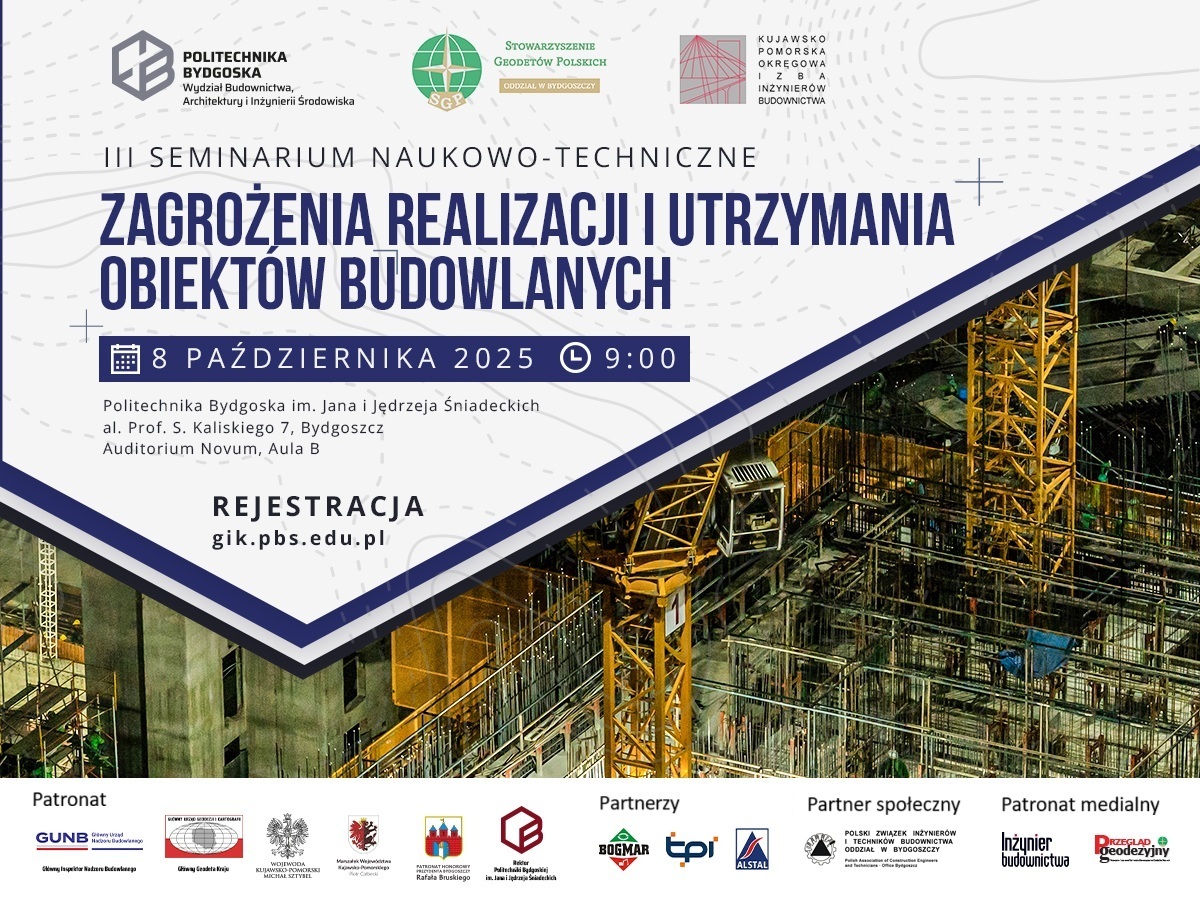 W dniu 8 października 2025 r. na Politechnice Bydgoskiej im. Jana i Jędrzeja Śniadeckich odbędzie się III seminarium naukowo-techniczne nt. Zagrożenia realizacji i utrzymania obiektów budowlanych. Głównymi pomysłodawcami cyklu seminariów są członkowie bydgoskiego oddziału Stowarzyszenia Geodetów Polskich.