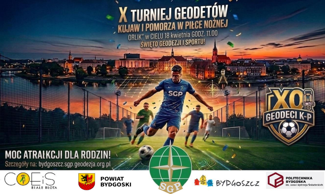 Zapraszamy do udziału w X Turniej Geodetów Pomorza i Kujaw w Piłce Nożnej, który odbędzie się 18 kwietnia 2026 roku w Cielu na tamtejszym ORLIKu.